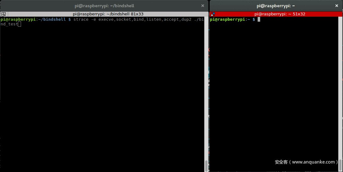pi@raspberrypi:~/bindshell $ strace -e execve,socket,bind,listen,accept,dup2 ./bind_test