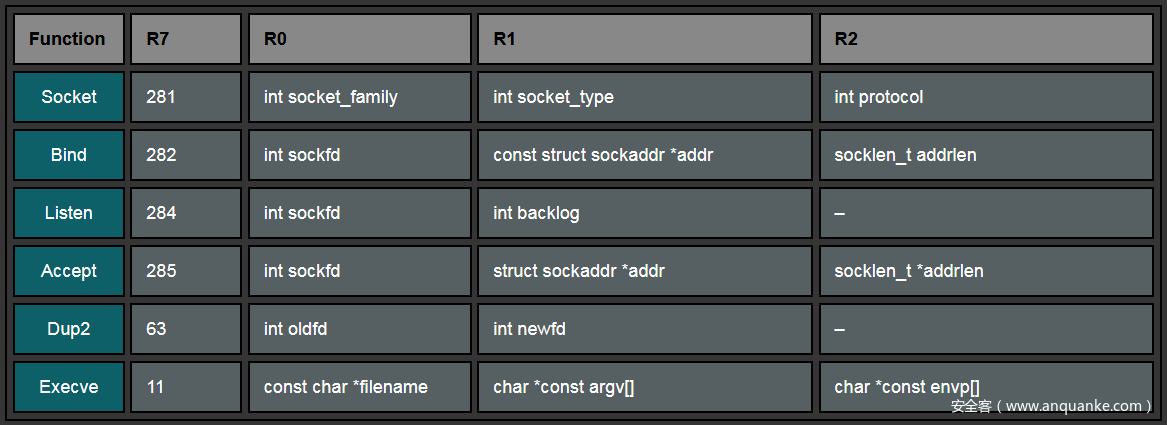 读完本教程后,你可以了解如何编写将shell绑定(bind)到本地端口的shellcode,也可以了解编写此类shellcode的常用手法。bind型shellcode与反弹型(reverse)shellcode差别不大,只有1~2个函数或者某些参数有所差异,其余大部分代码基本相同。编写bind或reverse shell远比创建简单的execve() shell复杂得多。如果你想从简单的开始学起,你可以先学一下如何使用汇编语言编写简单的execve() shell,然后再深入阅读本篇教程。如果你需要重温Arm汇编知识,你可以参考我之前写的ARM汇编基础系列教程,或者参考如下这张图: