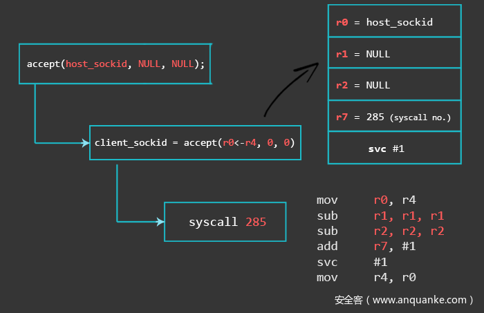 这里我们同样需要将前面保存的host_sockid存放到r0中。由于我们要避开null字节,因此我们不会直接将#0移动到r1和r2中,相反,我们通过减法让这些寄存器清零。然后将R7值加1。调用完成后我们可以得到client_sockid,将这个值存放到r4中即可,此时我们已经不再需要将host_sockid保存到这个位置(我们会跳过C代码中的close函数调用语句)。