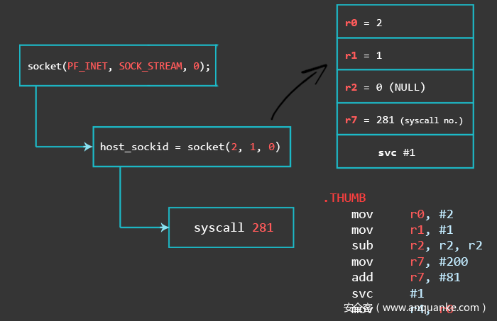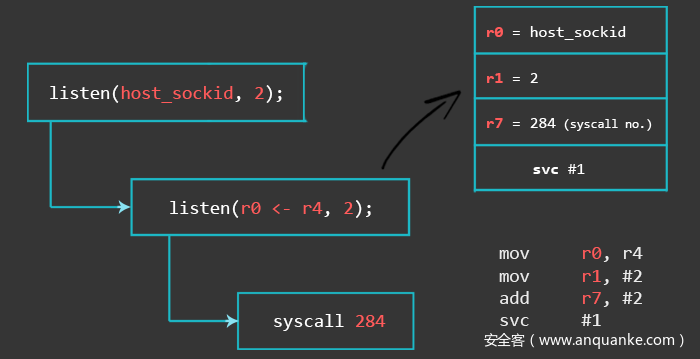 (2)举个例子:host_sockid = socket(2, 1, 0),socket调用的返回结果(host_sockid)会落在r0寄存器中。如listen(host_sockid, 2)之类的其他函数会复用这个结果,因此我们需要将结果保存到另一个寄存器中。