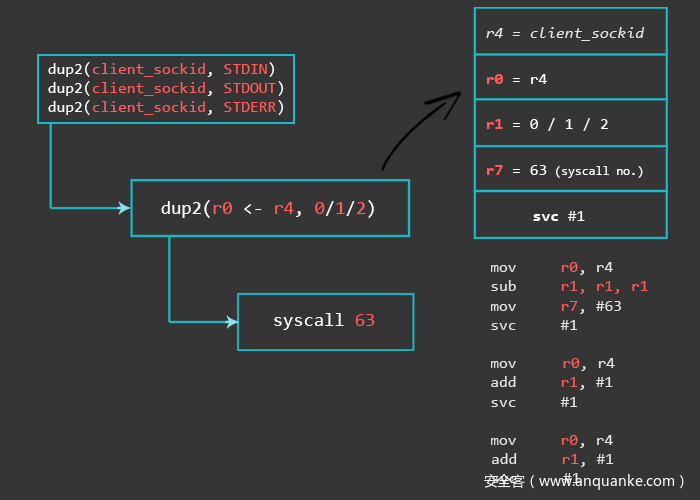 dup2函数的系统调用号为63。此时,我们需要将前面保存的client_sockid再次移动到r0中,然后通过sub指令将r1设置为0。对于剩下的两个dup2调用语句,我们只需要在每次系统调用完成后,改变r1的值,将r0重置为client_sockid即可。