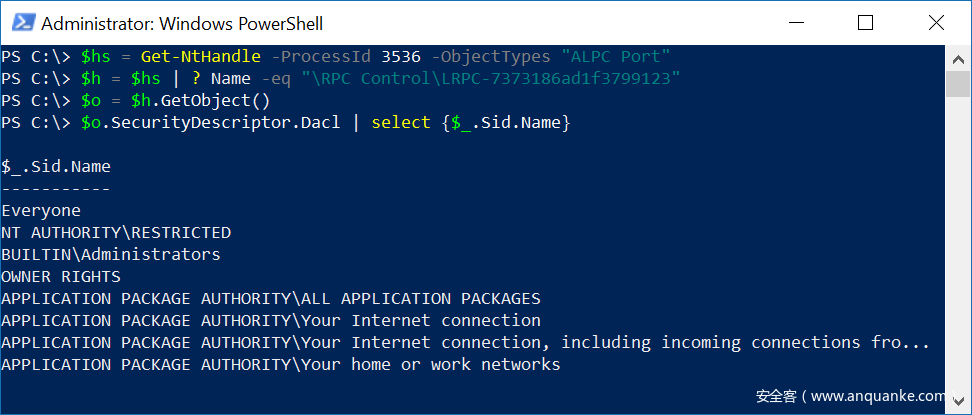 FwRpcAPIsIsPackageAccessGranted函数会获取调用者的token信息,查询软件包的Family Name,将该名称与硬编码的列表进行对比。如果调用者位于Edge包(或者某些beta版本)中,则返回成功,使上层函数跳过admin检查过程。这就能解释Edge如何将自己加入例外列表中,现在我们还需要知道需要哪些访问权限才能使用RPC服务器。对ALPC服务器来说存在两项安全检查,分别为连接到ALPC的端口以及一个可选的安全回调例程。我们可以选择逆向分析该服务所对应的二进制程序,但还可以选择更加简单的方法,从ALPC服务器端口进行转储,这一次我们还可以使用我的NtObjectManager模块。