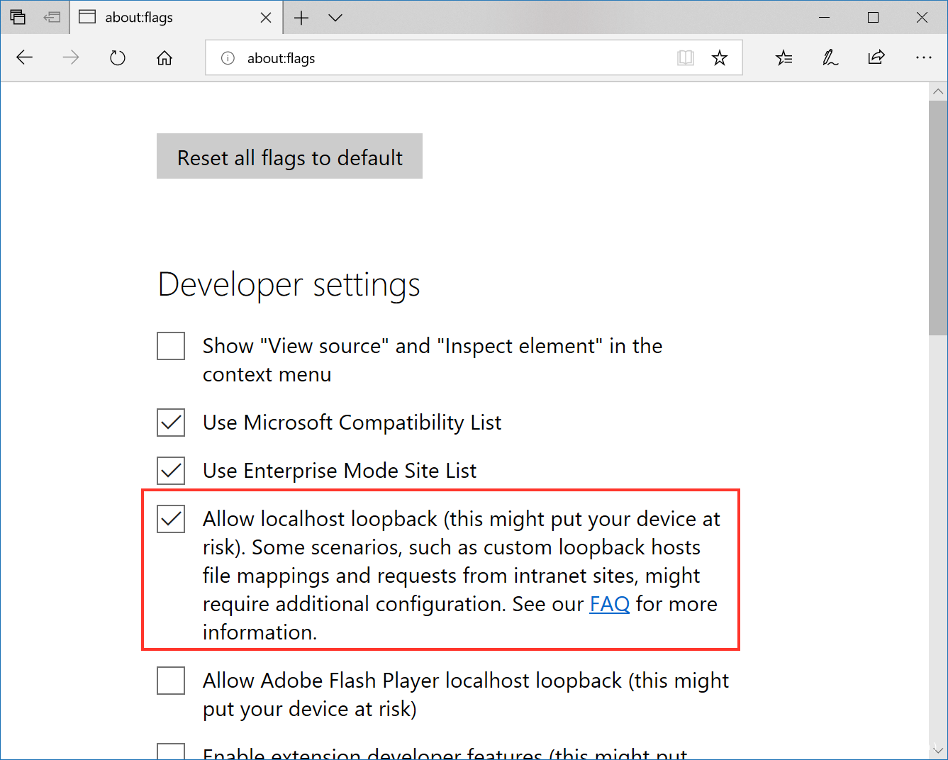 这一点并不奇怪。Edge刚发布时并不能访问localhost资源(比如,IBM在一份帮助文档中指导用户如何使用CheckNetIsolation来添加例外)。然而,在某个研发阶段中,微软添加了一个about:flags选项,允许Edge访问localhost资源,现在这个选项看起来已经变成默认配置,如下图所示(微软仍友情提示启用该选项可能使用户设备面临安全风险):
