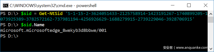 在我的Windows 10主机上,该列表中共有2个条目,应该没有应用会使用这种开发者功能,这一点比较奇怪。第一个条目的名称为AppContainer NOT FOUND,表示已注册的SID与已注册的AC不匹配。第二个条目的使用了看起来毫无意义的名称001,这至少表明这是当前系统上的一个应用程序。这究竟是怎么回事?我们可以使用我的NtObjectManager PS模块,根据对应的SID值,通过Get-NtSid cmdlet来分析001这个名字是否可以解析成更容易理解的名称。