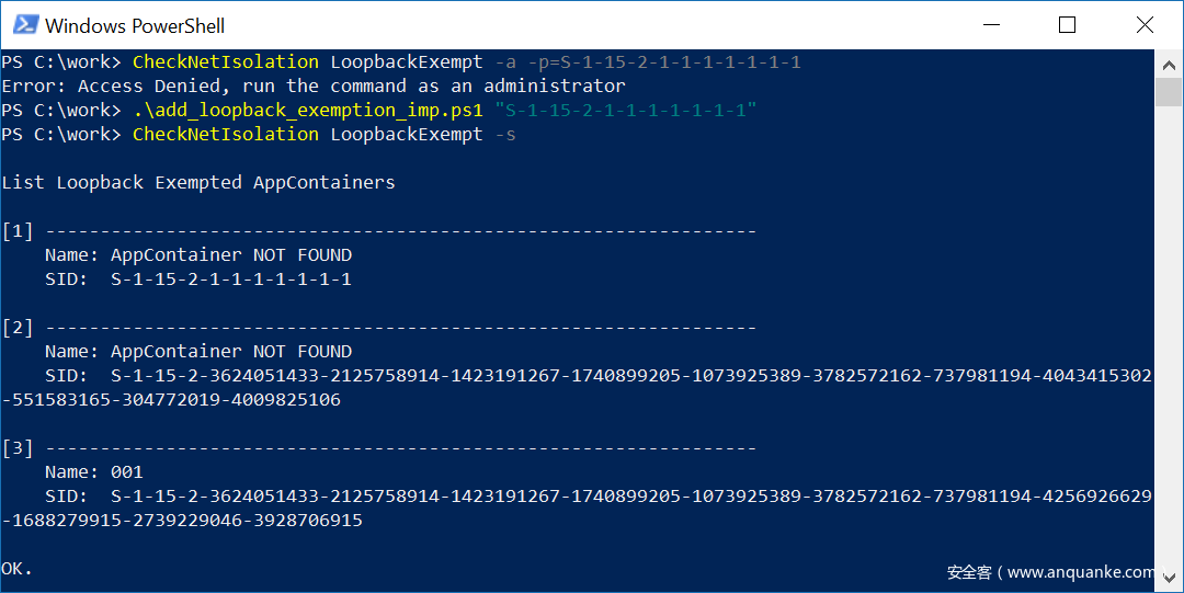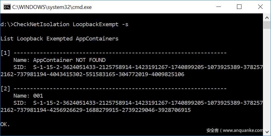 比较有趣的是,如果我们禁用这个选项并重启Edge,那么该例外条目就会自动被清除,而再次启用该选项又会自动恢复这个例外条目。为什么这一点比较有趣?这是因为根据以往的经验(比如Eric Lawrence写的这篇文章),我们需要管理员权限才能修改这个例外列表,也许微软现在修改了这个规则?我们可以验证这个猜测是否准确,使用CheckNetIsolation工具,传入-a -p=SID参数,具体命令如下: