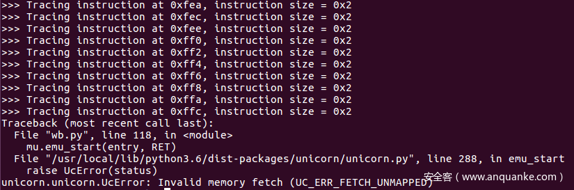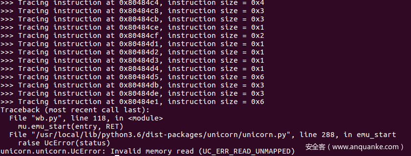 很不幸,程序挂了,Unicorn给出里一个读取未分配空间的异常:
