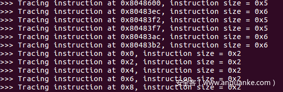 print('>>> Tracing instruction at 0x%x, instruction size = 0x%x' %(address, size))