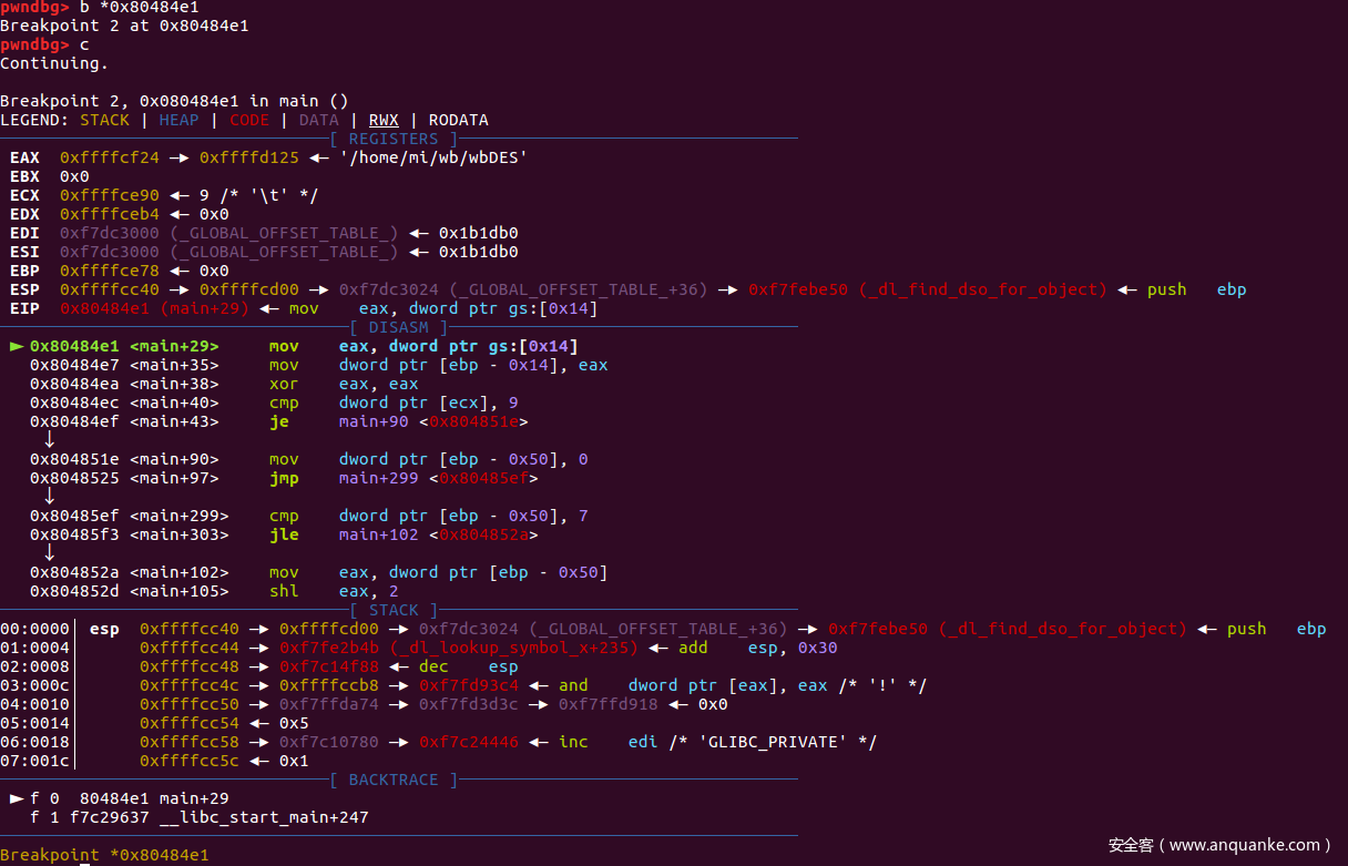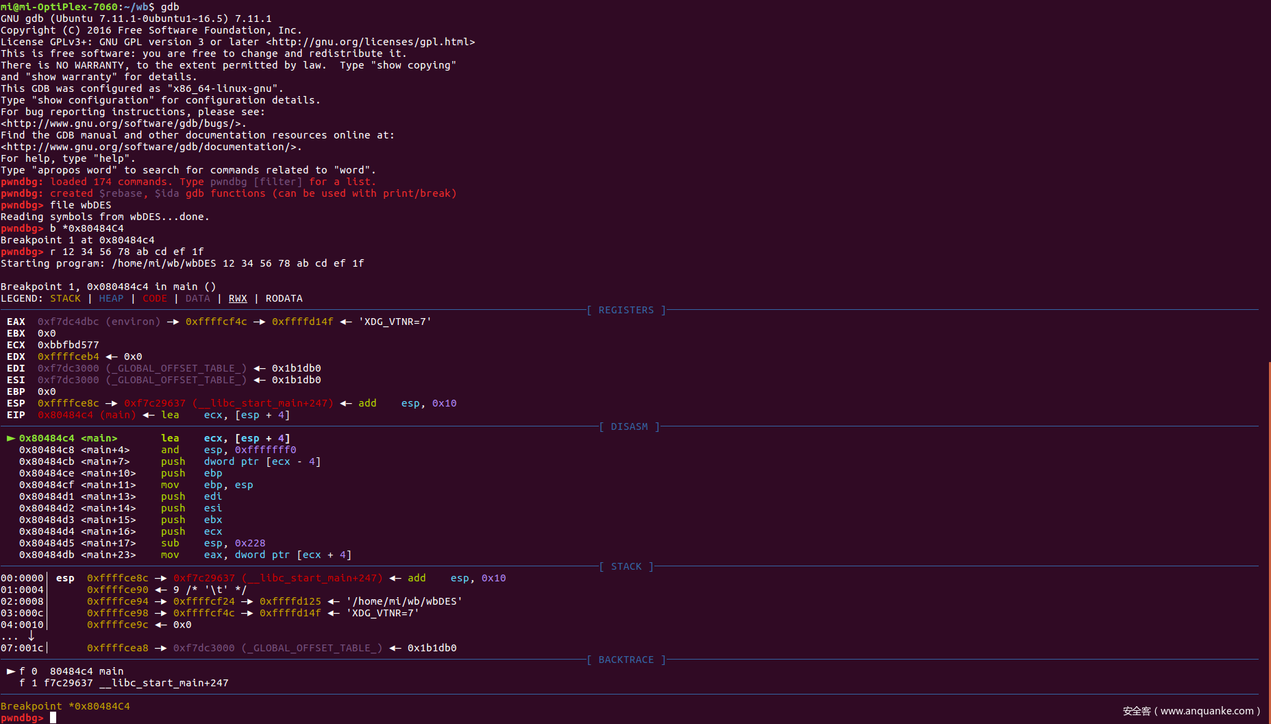 接下来需要对栈开始配置,在开始配置栈之前,我们需要动态调试确定一下指定函数调用之前,栈里有什么东西。使用gdb对main函数进行调试,在main函数的开始处 0x80484c4 设置断点并输入参数,启动GDB:
