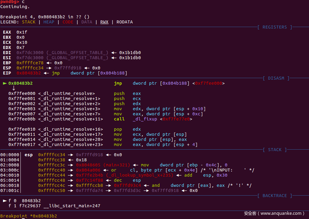 | 0xffffce8c——(esp) | 0xf7c29637 | RET | |