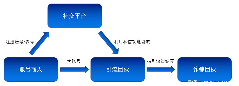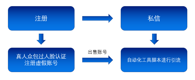 社交平台由于天然的聊天属性,导致变成了黑产广告引流、杀猪盘诈骗最严重的地方。黑产上游账号商人注册大量的虚假账号,然后把这些账号卖给中游引流团伙,引流团伙利用自动化工具和脚本批量的平台用户发“加微信”或者“做兼职”等私信进行引流到微信号或者QQ号。下游诈骗团伙在微信或者QQ上对引流成功的账号进行进行诈骗。一方面大量的垃圾广告会影响平台的用户体验,另一方面如果一旦脱离的平台的用户被诈骗成功,及时是不发生在社交平台内,也会对平台的口碑和形象造成极大的影响。
