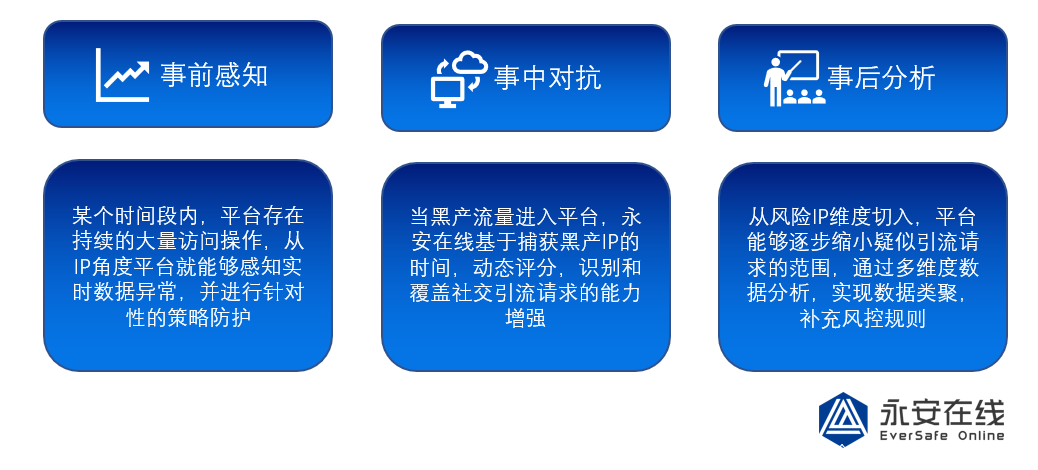 总的来说,平台利用业务风险IP情报这个维度,平台从事前事中时候逐步收束疑似站外引流的范围,并结合已有的数据维度,实现特征归类,逐步补齐业务风控模型。