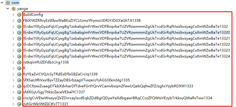 (1)Spymax间谍软件制作的应用文件结构中只有一个包,包内包含多个名称相似的类,类都经过了混淆。