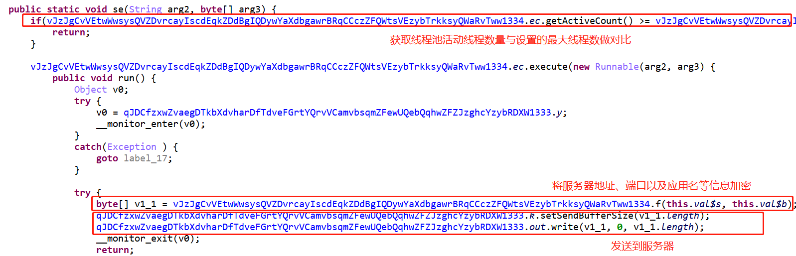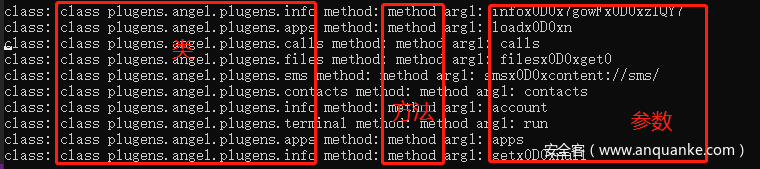 服务器发送至客户端的命令包含需要加载的恶意文件内容、类名、方法名以及参数信息。当攻击者在服务器控制面板点击查看用户不同的信息时,服务器就会发送不同指令。