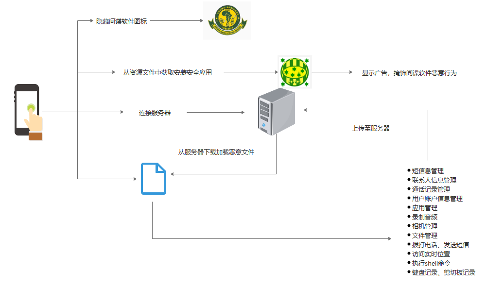 恶意程序运行主要分为两个个阶段,首先间谍软件为了掩饰自己的恶意行为安装启动后便隐藏自身图标然后从资源文件中获取安装另一款安全的应用。接着恶意程序连接服务器,根据服务器下发的命令从服务器下载不同的恶意文件,并加载执行其恶意行为。
