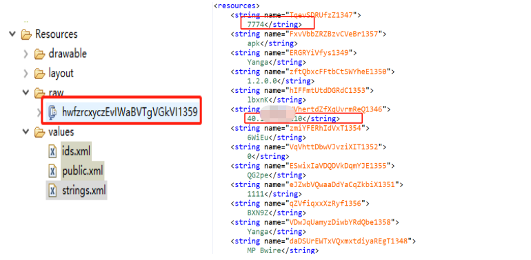(2)资源文件的raw目录下包含一个apk文件,values目录下主要包含三项配置文件。配置文件中包含绑定的IP和端口信息。