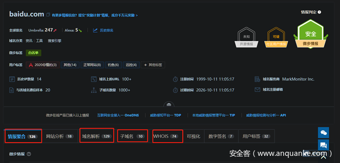 RISKIQ社区数据做的比较全,基本上基于一个域名或者IP,你能想到的相关信息都涵盖了,可惜数据虽然多但不是都有用,需要搜索者自己有判断信息的能力,否则可能沦陷到海量的信息中不知道该用什么。