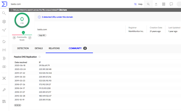 同样有历史pdns数据查看功能。以及查看域名相关连接的恶意样本,域名当前Whois信息,比较可惜的是由于假设在境外,国内用户的访问速度不理想,同时对于英语不好的同学也不是很友好。