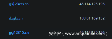 这里可以看到共有98个域名解析到这个地址。这是第一个需要怀疑的点,一个正常的工商类型的域名,解析IP不应该同时被这么多域名解析,按照常理正常的服务器应该只提供单个网站的功能,被这么多域名解析,必有蹊跷!