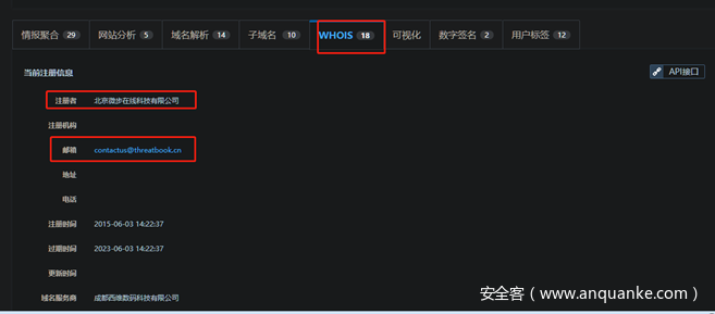举个例子,在X社区查threatbook.cn,打开whois信息,可以看到下图的这个页面: