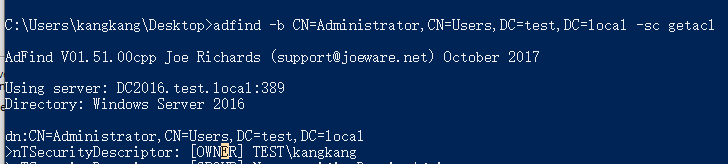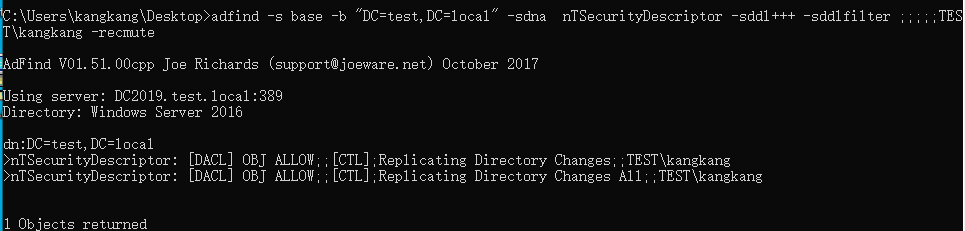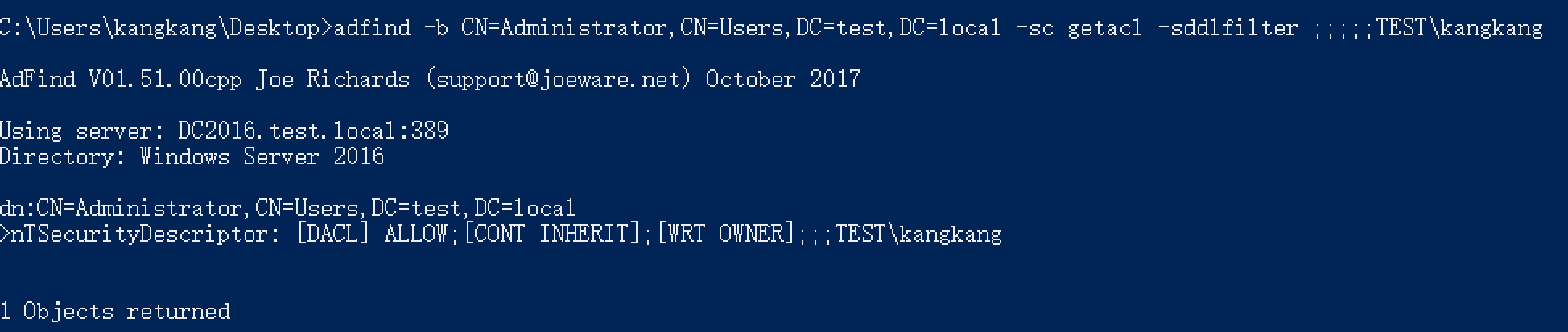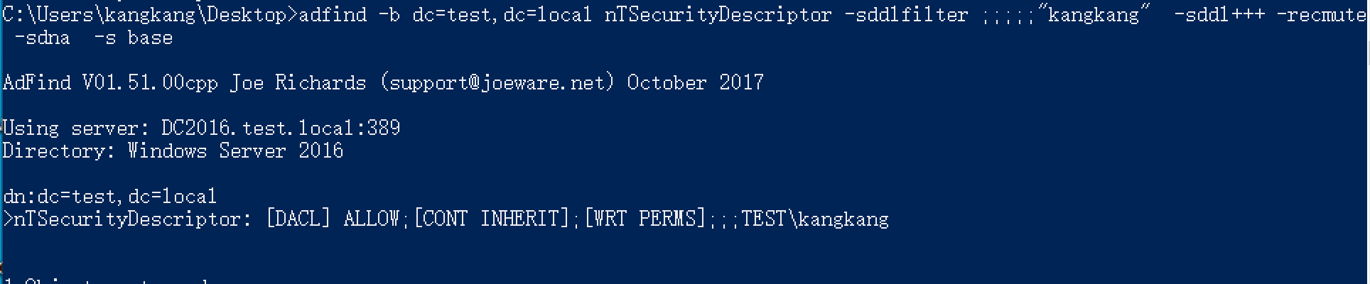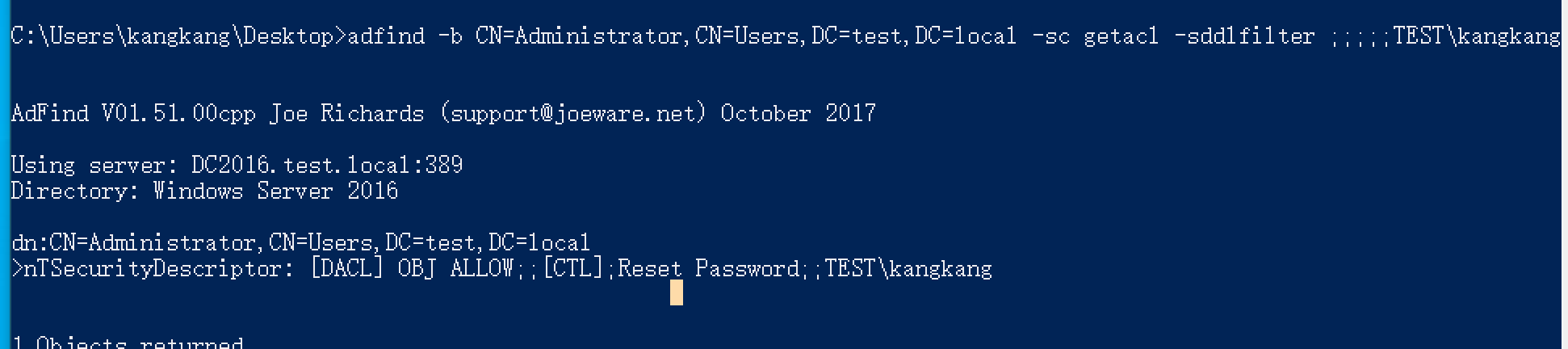 Kankang 称为所有者之后,其实也就具备了WriteDacl的权限了。这里我给kangkang 自己增加了修改密码的权限,其实利用思路的可以自己扩展。