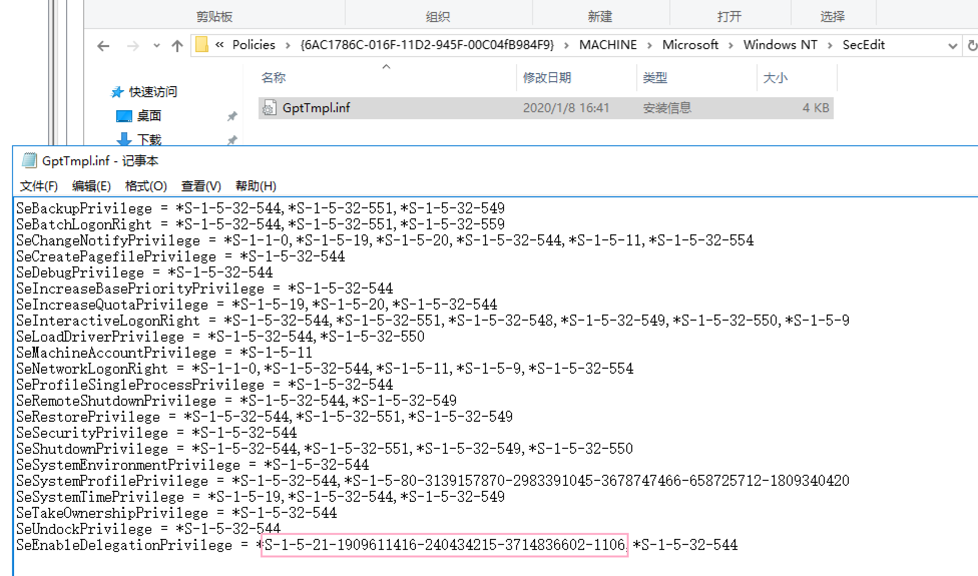如果我们需要赋予域用户特权一般都是通过组策略下发。比如说默认情况底下的Default Domain Controllers Policy(GUID={6AC1786C-016F-11D2-945F-00C04FB984F9})这条组策略会把SeEnableDelegationPrivilege这个特权赋予Administrators