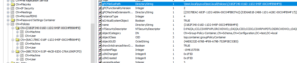 这个是一个跟组策略有关的属性,关于组策略。这里我们关心的是GPC-File-Sys-Path这个属性,这个属性讲GPO与GPT链接起来,GPT是组策略具体的策略配置信息,其位于域控制器的SYSVOL共享目录下,也就是说,如果我们能够控制GPC-File-Sys-Path的话,可以将ad活动目录里面的gpo指向我们自定义的GPT,而GPT里面包含的是组策略具体的策略配置信息,也就是说我们可以修改组策略配置信息的内容。
