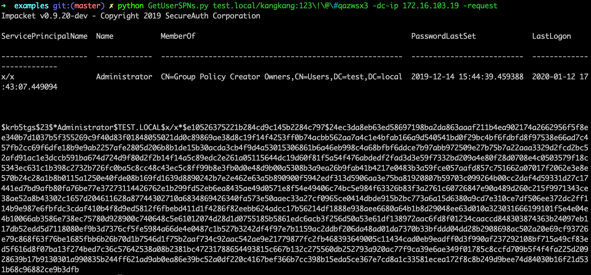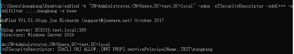 如果对一个对象有写入spn的权限,那么就可以对这个对象进行kerberosting了,如果密码强度不强的话,有机会获取到密码。