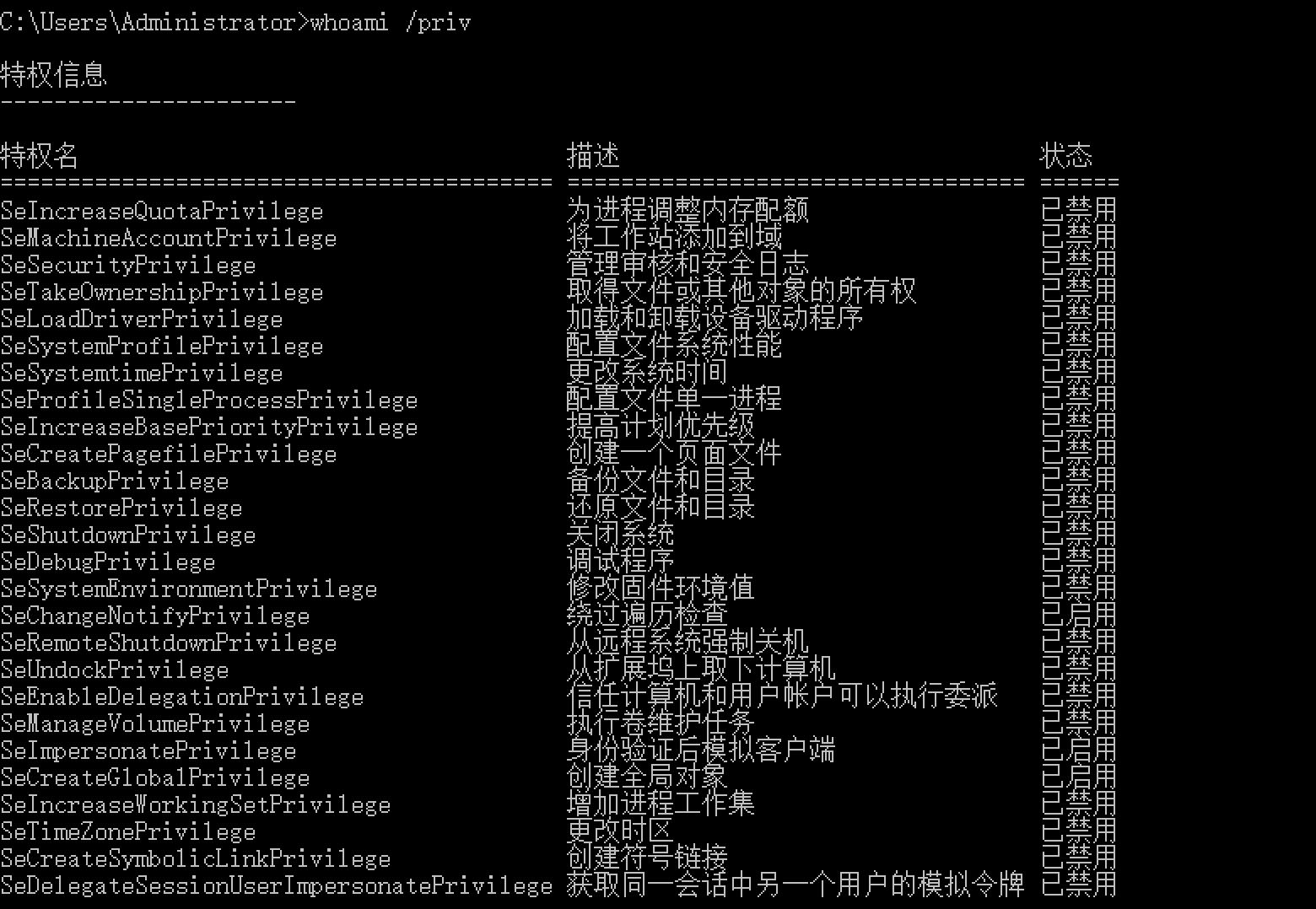 而查询一个用户具备的特权,可以用whoami /priv来查看