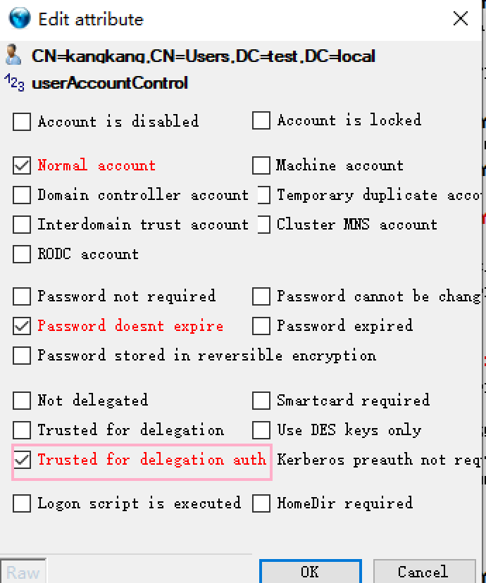 ● 修改kangkang的userAccountControl,加上TRUSTED_TO_AUTHENTICATE_FOR_DELEGATION