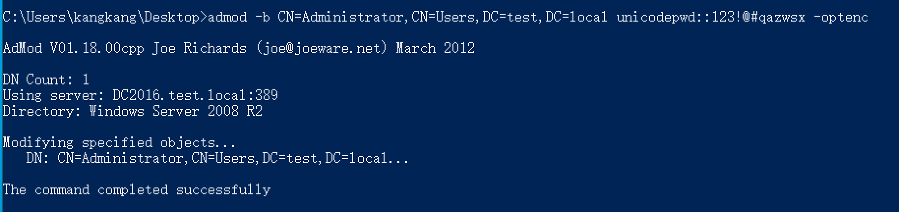admod -b CN=Administrator,CN=Users,DC=test,DC=local unicodepwd::123!@#qazwsx -optenc