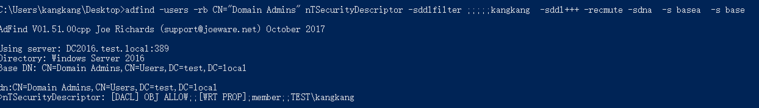 比如说kangkang这个用户具备对Domain Admin这个组的AddMembers权限,其实也就是对member(bf9679c0-0de6-11d0-a285-00aa003049e2) 这个属性的写权限。