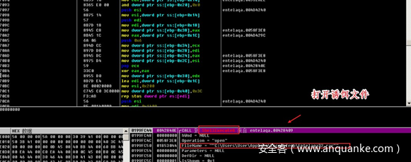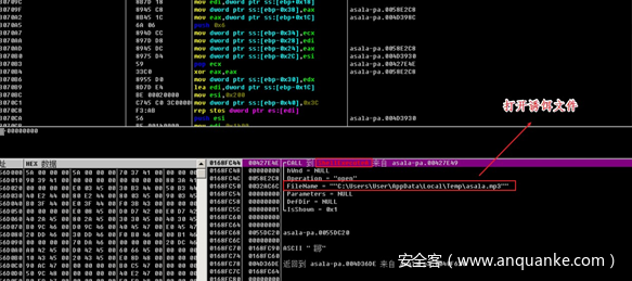通过ShellExecute 函数将%Temp%\asala.mp3 打开