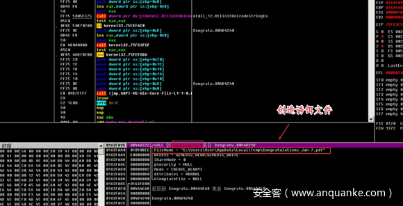 通过CreateFile 函数将文件源数据写入%Temp%\Congratulations_Jan-7.pdf (诱饵文件)中