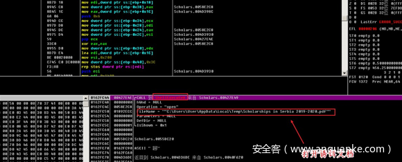通过ShellExecute 函数将%Temp%\Scholarships in Serbia 2019-2020.pdf 打开