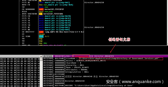 通过CreateFile 函数将文件源数据写入%Temp%\Directory of Government Services.pdf (诱饵文件)中