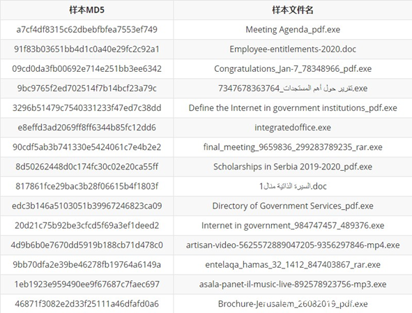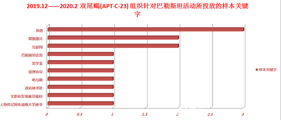 通过之前的分析我们发现了该组织拥有很强的技术对抗能力,并且其投放的样本一直围绕着与巴勒斯坦和以色列的敏感话题进行投放,我们对其话题关键字做了统计,方便各位看官了解