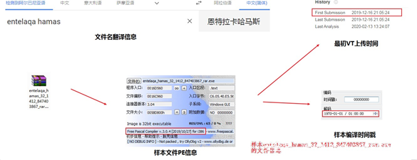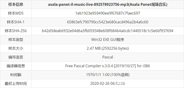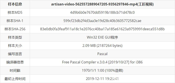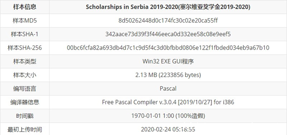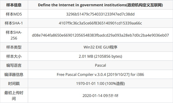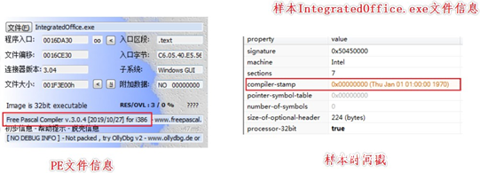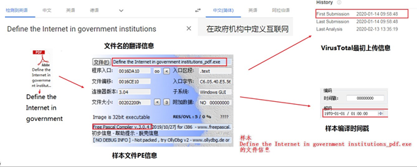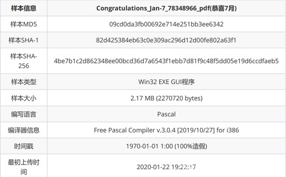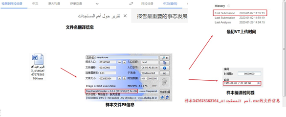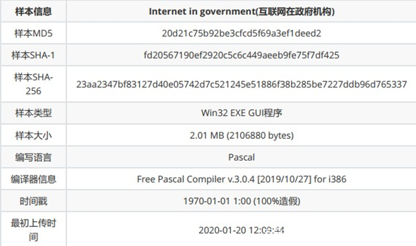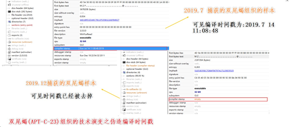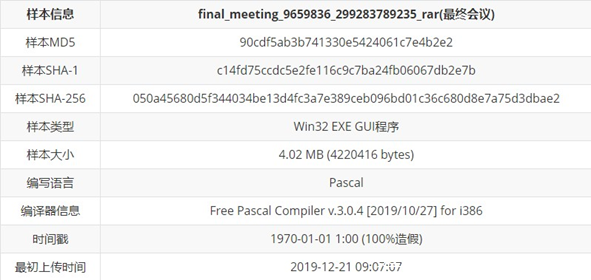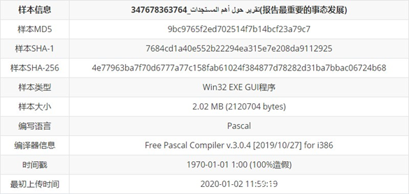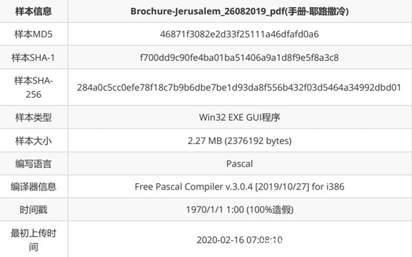 载荷的时间戳信息大部分时间集中位于北京的下午以及第二天的凌晨,属于中东地区的时间。而在 2019年 7 月份捕获的双尾蝎APT组织样本中该组织的编译戳为 2019.7.14 11:08:48 而在本次活动所捕获的 样本中我们发现该组织将编译时间戳统一改为: 1970.1.1 1:00 ,也就是置0.通过伪造时间戳以阻断安全人员的关联以及对其的地域判断