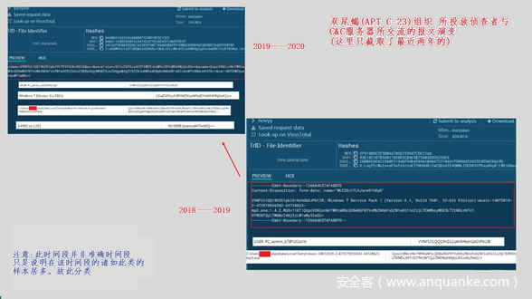 为了对比的方便,我们只对比双尾蝎APT组织 2018 年到 2019 年的上半年的活动与本次活动的C&C 报文的区别。如图所示下图的左上是本次活动的样本的C&C 报文,右下角的是 2018 年到 2019 年上半年活动的样本的C&C 报文。通过下面所给出的解密我们可以得知两个样本所向C&C 收集并发送的信息基本相同。同时值得注意的是该组织逐渐减少明文的直接发送收集到的注意而开始采用比较常见的通过Base64的方式编码后在发送。同时在ver版本中我们发现: 2018 年到 2019 年上半年的样本的后门版本号为: 1.4.2.MUSv1107 (推测是2018.11.07更新的后门);而在本次活动中后门版本号
