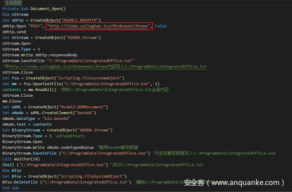 通过使用olevba dump出其包含的恶意宏代码(如下图所示:) 其主要逻辑为:下载该URL http://linda-callaghan.icu/Minkowski/brown 上的内容到本台机器的%ProgramData%\IntegratedOffice.txt (此时并不是其后门,而且后门文件的base64 编码后的结果)。