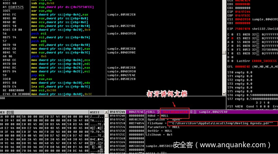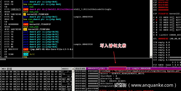 通过CreateFile 函数将文件源数据写入%Temp%\Meeting Agenda.pdf (诱饵文件)中