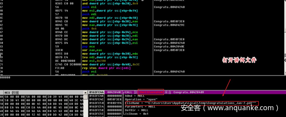 通过ShellExecute 函数将%Temp%\Congratulations_Jan-7.pdf 打开