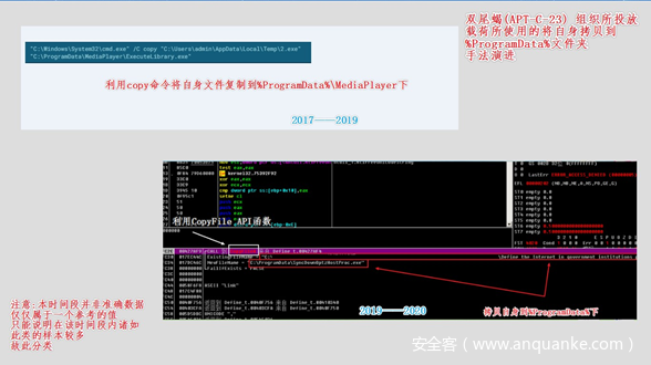 双尾蝎APT组织在 2017 年到 2019 年的活动中,擅长使用copy 命令将自身拷贝到%ProgramData% 下.而可能由于copy 指令的敏感或者已经被各大安全厂商识别。在 2019 年 7 月份的时候.该组织恢复了之前采用CopyFile windows API函数的方式将自身拷贝到%ProgramData% 下