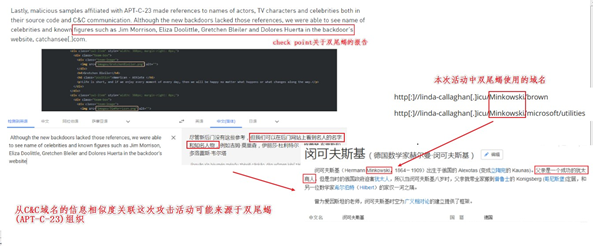 根据checkpoint 的报告我们得知,该组织乐于使用一些明星或者名人的名字在其C&C 服务器上.左图是 checkpoint 安全厂商揭露其针对以色列士兵的活动的报告原文,我们可以看到其中含有Jim Morrison , Eliza Dollittle , Gretchen Bleiler 等名字.而右图在带有恶意宏文档的样本中,我们发现了其带有Minkowski 这个字符.通过搜索我们发现其来源于Hermann Minkowski 名字的一部分,勉强地符合了双尾蝎APT组织的特征之一.