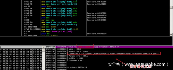 通过ShellExecute 函数将%Temp%\Brochure-Jerusalem_26082019.pdf 打开