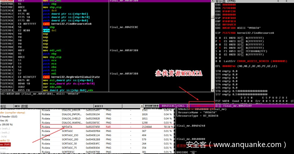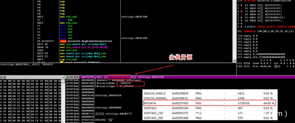 通过FindResource 函数查找资源MYDATA ,通过下图我们可以看出该资源是一个rar 文件