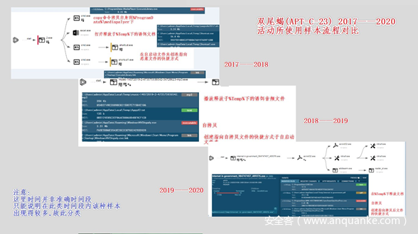 windows平台的可执行文件样本).在 2017 年到 2019 年的样本中我们可以看出其先在临时文件夹下释放诱饵文件,再打开迷惑受害者,再将自身拷贝到%ProgramData% 下.创建指向%ProgramData%下的自拷贝恶意文件的快捷方式于自启动文件夹.本次活动与 2018 年 2019 年的活动所使用样本的流程极为相似.如下图所示.故判断为该活动属于双尾蝎 APT组织。