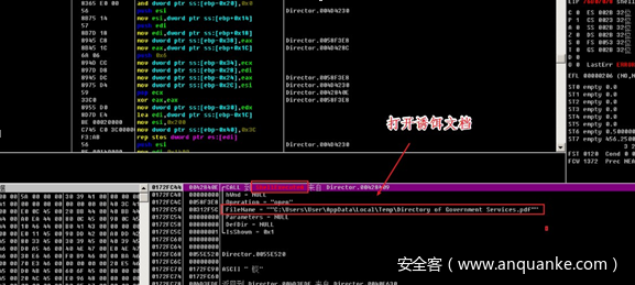 通过ShellExecute 函数将%Temp%\Directory of Government Services.pdf 打开
