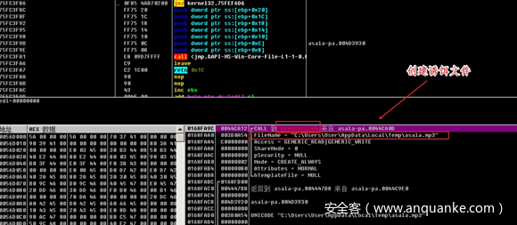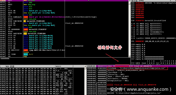 通过CreateFile 函数将rar 文件源数据写入%Temp%\jalsa.rar (诱饵文件)中