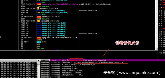 通过CreateFile 函数将文件源数据写入%Temp%\Entelaqa32.rar (诱饵文件)中