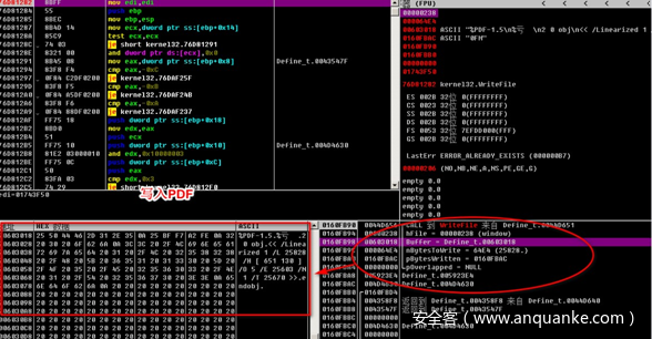 通过WriteFile 函数将PDF源数据写入创建的诱饵文档内